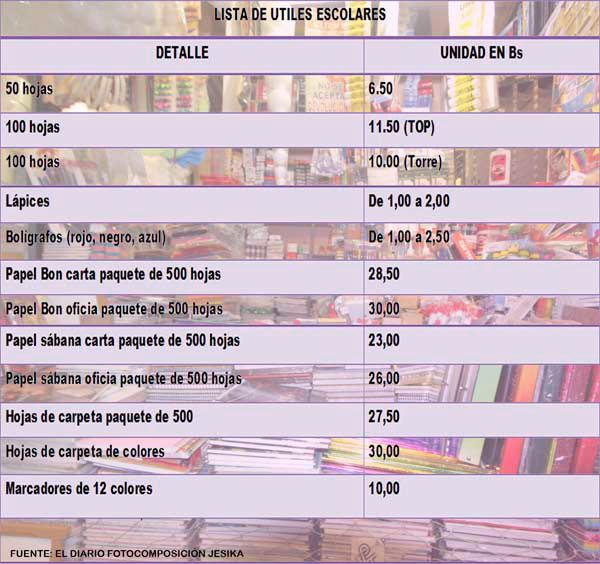 A pocas semanas del inicio de las labores escolares se comprobó que el material de escritorio se incrementó entre un 7% a 8% en relación a los precios de la pasada gestión, comentaron los empleados de varias librerías, además de comerciantes en los diferentes mercados de la ciudad de La Paz.