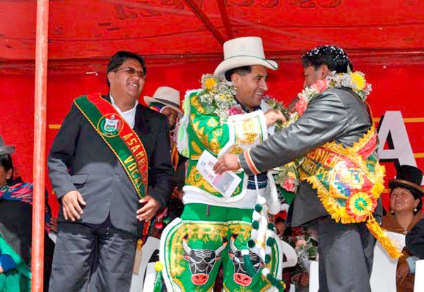 Por iniciativa de los pobladores del lugar, vistió un traje de color verde, de C’huta y manifestó que “esas demostraciones de afecto por parte de los comunarios lo comprometen a buscar políticas que hagan que el departamento de La Paz crezca”.