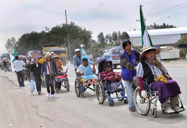 Las personas con discapacidad llegaron hasta Bombeo, localidad distante a 73 kilómetros de la capital valluna, tras movilización por 80 días que recorrieron 1.154 kilómetros por las ciudades de Trinidad, Santa Cruz y Cochabamba, soportando temperaturas muy altas, sol, lluvia, frío, alimentación deficiente y falta de atención médica.