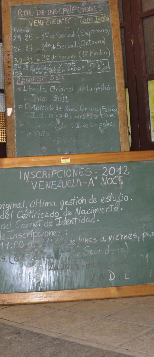En las puertas de estas escuelas nocturnas existe una constante que invade incluso las ventanas de los establecimientos o los postes de luz cercanos, pancartas, pizarras o afiches dan a conocer las ventajas del estudio en estas instituciones junto a los requisitos para la inscripción.