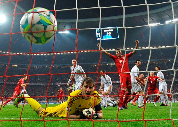 El francés, Karim Benzema, fue el más peligroso en la primera parte, se topó con Neuer en dos ocasiones. Ambas con tiros centrados tras sus buenos movimientos. En un saque de esquina, de nuevo el error más cometido por el equipo de Mou a balón parado, llegó el primer gol. Ramos midió mal y perdió la visión de la trayectoria del balón. El rechace en Badstuber lo aprovechó Ribery para fusilar a Casillas, con Luis Gustavo en fuera de juego en la trayectoria del balón.