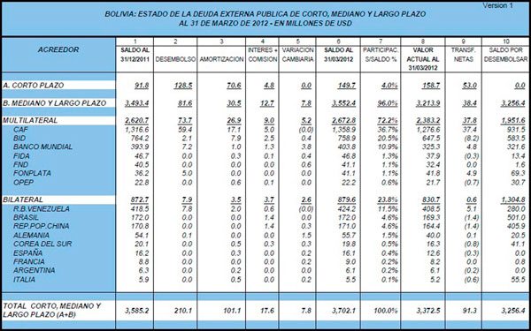 La deuda externa pública de corto, mediano y largo plazo llegó a $us 3,256 millones al 31 de marzo de 2012, señala el boletín oficial del Banco Central de Bolivia (BCB) que detalla que la deuda multilateral suma $us 1,951 millones mientras que la bilateral asciende a 1,304, de esta última, Brasil y China se han convertido en los principales acreedores con el 70% de esa obligación, seguidos por Venezuela (21%).
