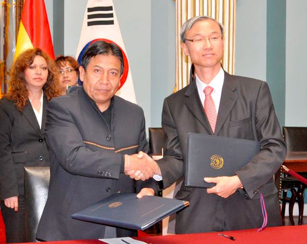 Durante la jornada de ayer el canciller David Choquehuanca y el embajador de Corea del Sur, Chun Young Wook, realizaron la firma del convenio de proyectos de salud y asistencia técnica, principalmente para el departamento de Oruro.