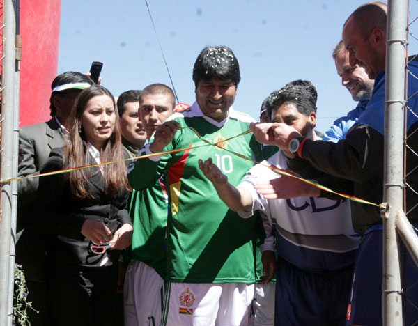 Para esta inauguración se presentó el Primer Mandatario de la Nación, Evo Morales, quien junto a su equipo esperaba enfrentarse al representativo de la CBN, reforzado por Cafú. El encuentro se desarrolló de igual manera a pesar de la ausencia del ex jugador, tras las repetidas disculpas de los representantes de la empresa y del Presidente del Estado.
