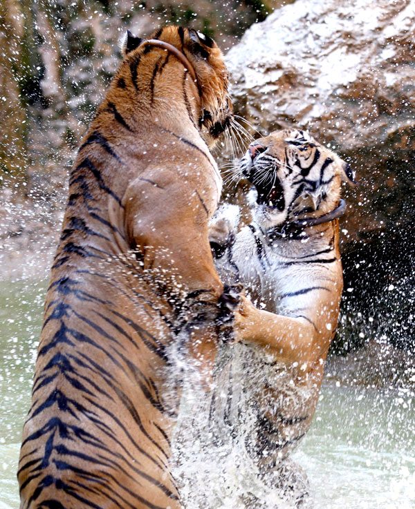 Un par de tigres juegan en un estanque en el Templo del Tigre de la provincia de Kanchanaburi (Tailandia). El primer tigre llegó al templo en 1999 cuando varios lugareños encontraron a una pequeña cría huérfana y la llevaron a Wat Pa Luangta Bua Yannasampranno, un templo budista. A partir de ahí el abad Chan creó un santuario para tigres que se ha convertido en una importante atracción turística y en uno de los pocos lugares del mundo en que se permite a los visitantes tocar a los tigres.