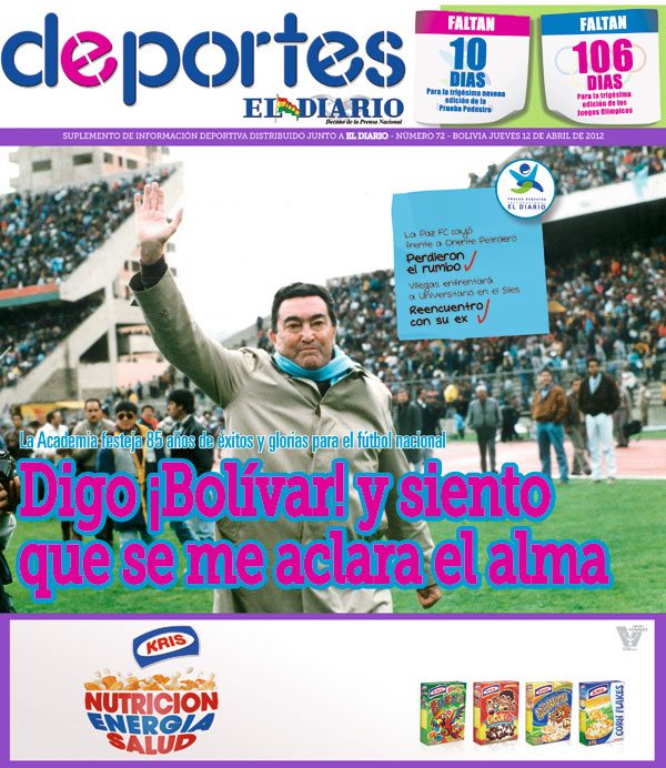 El club Bolívar, una de las instituciones más grandes del país y el equipo más ganador de la historia del fútbol nacional, celebró el pasado 12 de abril un aniversario más, y Deportes El Diario le rindió un homenaje mostrando en la portada al mejor presidente que ha tenido el club, Mario Mercado Vaca guzmán, y con una memorable frase de Fernando Diez de Medina, un gran escritor boliviano. ¡Digo Bolívar y siento que se me aclara el alma!
