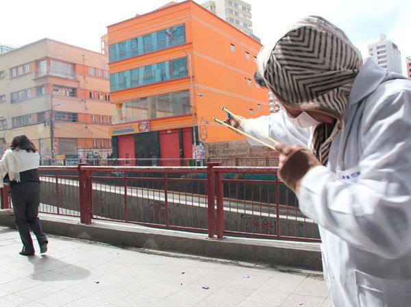A las 13.05 empezó el choque, cuando los estudiantes lanzaron petardos y canicas contra el edificio del Ministerio de Salud, de manera que ante la explosión de los vidrios reaccionó la Policía lanzando algunos gases para dispersar a los estudiantes distribuidos por grupos y regiones departamentales.