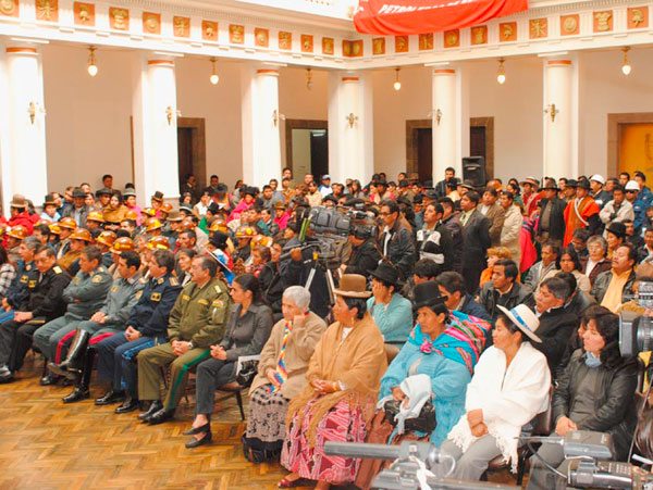 El presidente Evo Morales asumió el poder con una inédita votación y la replicó para su segundo mandato superando el 63 por ciento. El mandatario aseguró un “proceso de cambio” en la vida de los bolivianos, un cambio para vivir bien, en un Estado “incluyente y sin discriminación”, afirmando que las puertas que antes se encontraban cerradas a los indígenas y sectores populares estarían abiertas de par en par para que todos puedan ingresar.