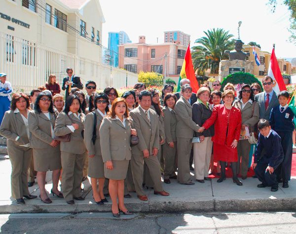 La ceremonia protocolar y la entrega de ofrendas florales se realizó ante el busto del Mcal. Francisco Solano López, en la zona de Calacoto, donde se dio cita la banda de la escolta Presidencial, integrada por los Colorados de Bolivia.