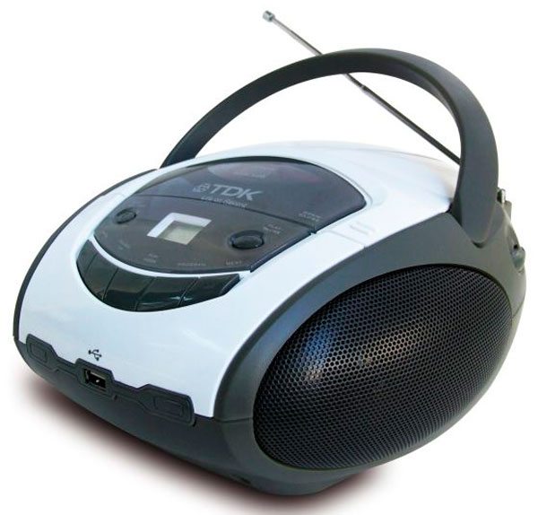 Les presentamos la nueva radio de TDK el TBC8717. Este es un sistema de audio portátil. Es una versión puesta al día del boombox muy común en los años 80. Con formas redondeadas y líneas en fuga, la combinación de colores (blanco y negro) que resulta muy actual. Los altavoces situados en los dos laterales, tapados por rejillas curvadas de color negro. En el frontal hay una diminuta pantalla informativa, que muestra la fuente que está seleccionada.