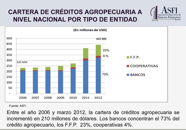 El crédito agropecuario en el oriente fue creciente los últimos cinco años, principalmente en Santa Cruz, manteniendo su participación, según datos de la ASFI. La cartera agropecuaria del oriente agrupa el 71% del total de la cartera agropecuaria a nivel nacional.