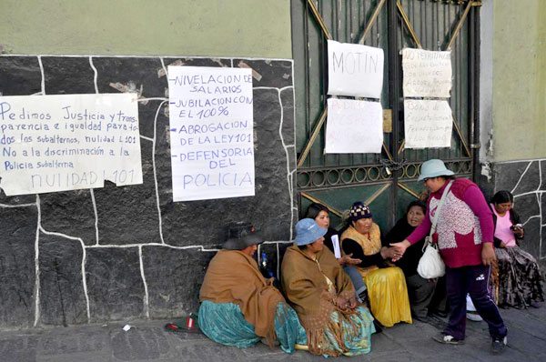 Las esposas de policías intensificaron sus medidas de protesta en ciudades capitales de departamento y dos urbes intermedias del país, en demanda de una nivelación salarial con relación a los militares, así como otras peticiones. En ese marco, el grupo de personas presionó ayer a los efectivos del orden a amotinarse.