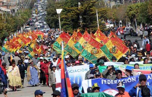 En el caso de La Paz, miles de campesinos afiliados a la Federación de Campesinos Túpac Katari, a la Central Obrera Regional de El Alto, a la Federación de Juntas Vecinales, entre otras, se concentraron en la Ceja de El Alto para marchar posteriormente por las principales calles de la Sede de Gobierno.