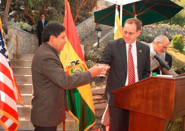 El diplomático se refirió también a los históricos lazos económicos, políticos y personales entre Estados Unidos y Bolivia y el compromiso basado en los principios de igualdad y beneficio mutuo. Recordó el acuerdo marco firmado en noviembre del 2011, que establece los principios mencionados y dijo que a raíz de la firma del acuerdo siguen comprometidos con el pronto retorno de los embajadores.