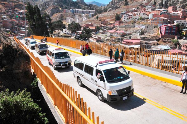 En la oportunidad el presidente del Comité de Vigilancia de este distrito, David Damián, agradeció por la ejecución de esta obra que fue calificada de maravillosa y con mucha visión para La Paz, por la conexión de la zona Sur con el Centro y anunció de forma oficial que este puente posibilitará el servicio de la línea de minibuses 276, que ingresará por Alto Obrajes hasta la zona Verde Olivo, con la posibilidad de llegar hasta el Cementerio. Además, comunicó que este servicio de transporte se efectuará con la tarifa congelada.