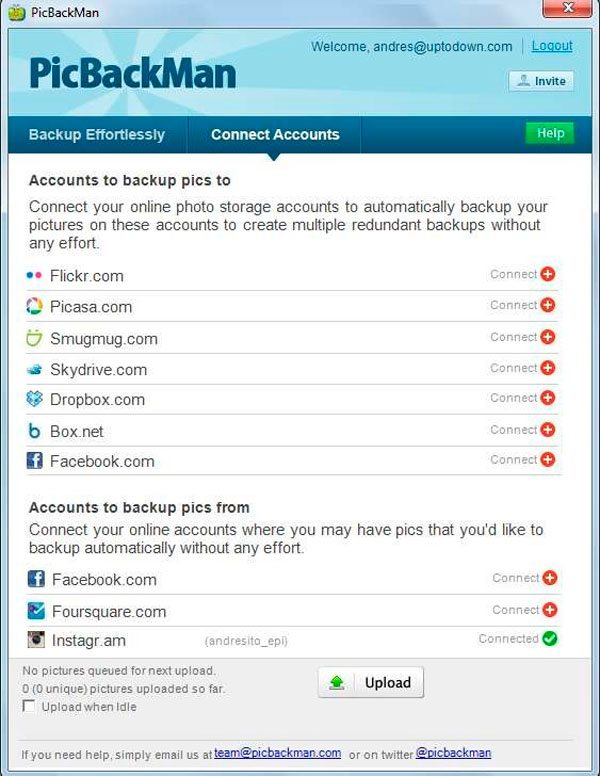 PickBackMan es un programa con el que puedes subir y/o descargar fotos de servicios como Flickr, Picasa,Dropbox, Facebook, Foursquare, Instagram.