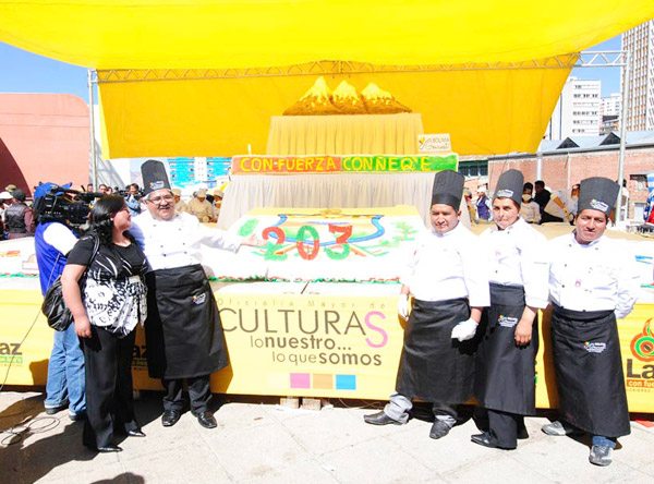 El gerente administrativo de Bolivia Gourmet, Miguel Ángel Becker señaló que la torta fue elaborada en ocho días y que se logró una dimensión de siete por cinco metros.