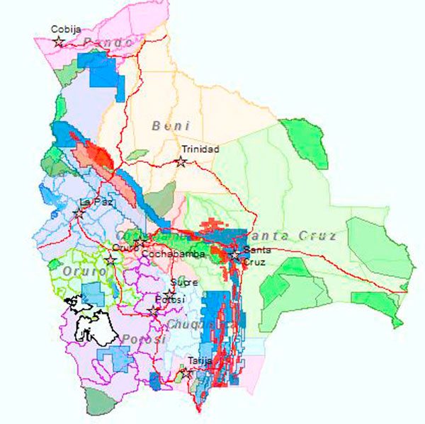 El denominado: “Sistema de Información Geográfico de Hidrocarburos”, cuenta con mapas de áreas reservadas para YPFB, Contratos de Operación, Áreas Protegidas Nacionales y Tierras tituladas por el Instituto Nacional de Reforma Agraria (INRA).