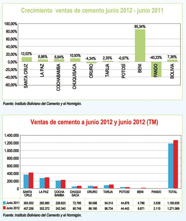 De acuerdo a Datos del Instituto Boliviano del Cemento y el Hormigón publicados en el boletín “Tabla Económica” de la Cámara Nacional de Industrias, las ventas de cemento en Bolivia crecieron 7,36% a junio de 2012 respecto al mismo periodo el año pasado.