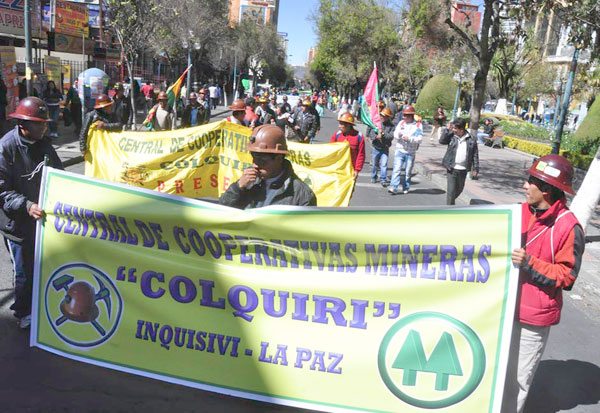 Los cooperativistas mineros de Colquiri paralizaron ayer el tráfico de vehículos en las principales calles de la ciudad de La Paz. Los manifestantes exigen a las autoridades la entrega inmediata de la llamada “veta Rosario”, un rico yacimiento de estaño.