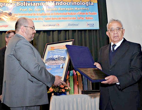 El acto se cumplió el pasado jueves en el hotel Europa de La Paz en ocasión de la realización de la cena de gala con motivo de la inauguración del VII Congreso Boliviano de Endocrinología, que llevó el nombre del homenajeado, en el cual se reunieron médicos endocrinólogos del exterior y de todo el país.