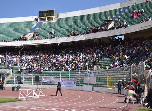 Ayer en la tarde la selección nacional tuvo una práctica fuera de lo común. Mientras ellos comenzaban a trabajar en la curva sur del estadio Hernando Siles se llevaba a cabo una asamblea con la presencia masiva de productores de la hoja de coca.