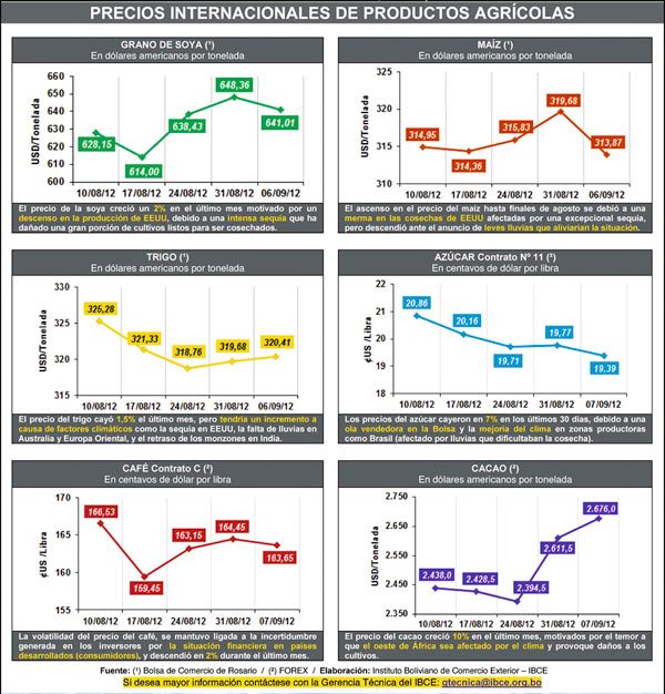 El precio de la soya creció un 2% en el último mes motivado por un descenso en la producción de Estados Unidos, debido a una intensa sequía que ha dañado una gran porción de cultivos listos para ser cosechados. El ascenso en el precio del maíz hasta finales de agosto se debió a una merma en las cosechas del país del norte, que son afectadas por una excepcional época seca, pero que descendió ante el anuncio de leves lluvias que aliviarían la situación, señala un informe del Instituto Boliviano de Comercio Exterior (IBCE).