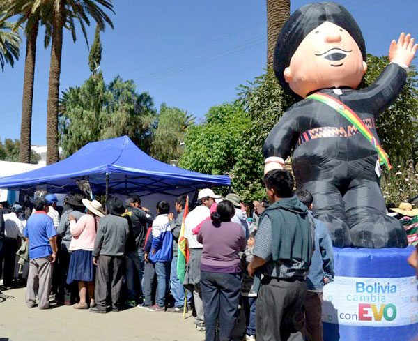 La figura del presidente es explotada en diversas formas como este muñeco inflado que simula a un lego tamaño extra grande. El culto a la personalidad es una característica del régimen del MAS que ve en Evo Morales la encarnación misma del denominado “proceso de cambio”.