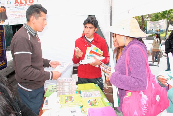 La Defensoría del Pueblo se asoció ayer al “Día Internacional de Lucha contra la trata de personas”. Dicho convenio, que marca la activa participación de esta entidad, inició con la instalación de 16 puestos de información y concientización de este problema social en la feria dominical que se realiza en El Prado paceño.