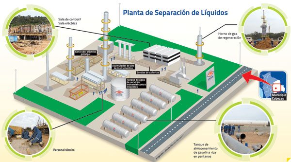 Estos equipos tienen la función principal de separar los componentes líquidos del gas natural y procesar el energético para devolver a la corriente de exportación el gas seco que se comercializa a Brasil.