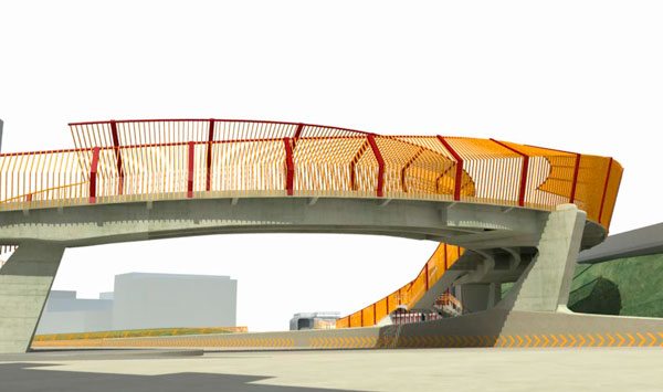 De acuerdo con el diseño final de la obra, la pasarela contará con rejas altas, amarillas y rojas en los bordes para evitar la precipitación de los peatones.