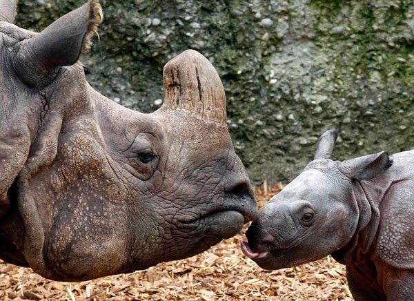 Un rinoceronte indio junto a su cría con nueve días de nacida y con un peso de 60 kilos, caminan al aire libre en el zoológico de Basilea. Esta especie es una más de las que está en peligro de extinción en todas las regiones donde viven, la amenaza de mayor notoriedad es la que presentan los cazadores que rompen las normas legales. (Reuters)