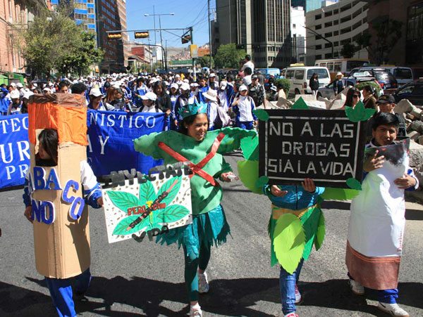 Con la presencia de más de 12 mil estudiantes de la ciudad de La Paz, se realizó ayer la marcha nacional de prevención contra el consumo de drogas y alcohol, que comenzó en la Plaza Mayor de San Francisco y concluyó con un festival organizado por la Fuerza Especial de Lucha Contra el Narcotráfico (Felcn), en el Teatro al Aire Libre.