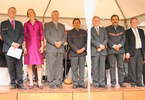 En la parte baja de los amplios jardines se armó una feria para mostrar los programas de cooperación alemana, los cuales buscan mejorar el riego, la producción y comercialización de productos del Chaco, los valles y parte de las tierras bajas de Bolivia, en el marco de los 50 años de cooperación boliviano- alemana.
