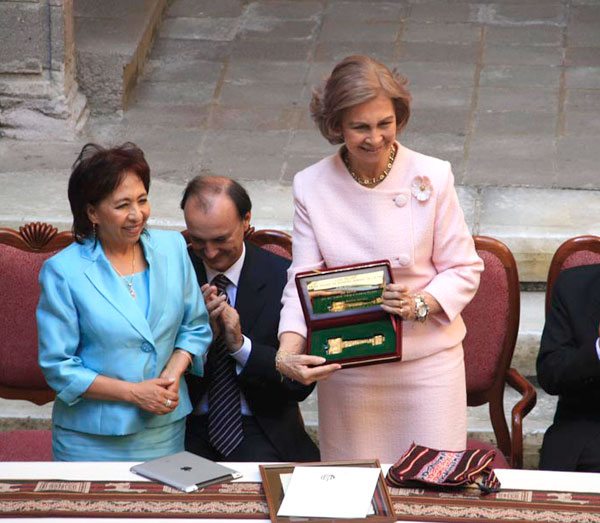 La Reina de España, Sofía de Grecia, durante su visita al municipio paceño, recibió ayer las “Llaves de Oro de la Ciudad” de manos de la alcaldesa interina Gabriela Niño de Guzmán, a tiempo de ser declarada “Huésped Ilustre” en acto efectuado en el Museo de Arte.
