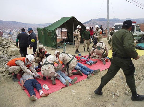 La reacción inmediata en caso de un desastre natural protagonizada en un simulacro por habitantes de la urbanización Llanos del macrodistrito San Antonio, es replicada a la población de la zona que no asistió a este evento y sigue las instrucciones por un video grabado semanas atrás.