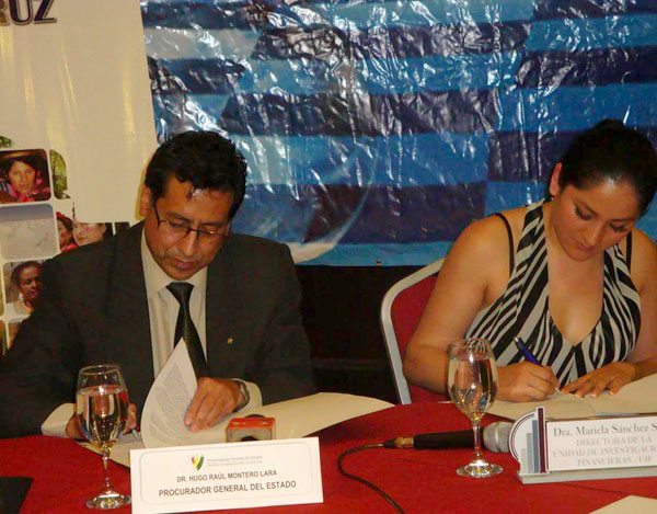 Con el objetivo de facilitar el acceso de la Procuraduría General del Estado a la base de datos de la Unidad de Investigaciones Fiinancieras (UIF), para el acceso a información fidedigna, presuntos hechos de corrupción, esta repartición dependiente de la Autoridad de Supervisión del Sistema Financiero (ASFI) representada por su directora, Mariela Sánchez Salas, firmó un convenio con el Procurador, Hugo Montero.