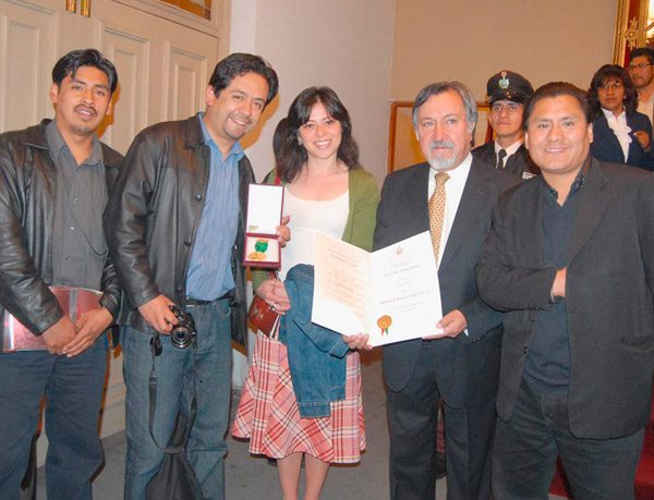 Yuri Flores, José Luis Columba, Daniela Vásquez, Juan Carlos Salazar y Jaime Loayza, tras recibir el galardon para la Agencia de Noticias Fides (ANF).