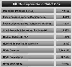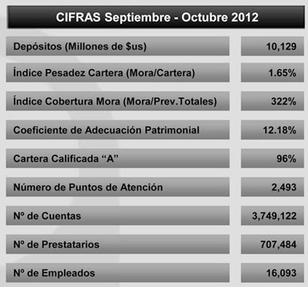 Sólo entre septiembre 2011 y septiembre 2012, los bancos han otorgado 845 millones de dólares de nuevos créditos a empresas micro, pequeñas y medianas, habiendo registrado los mayores crecimientos de 37,3% en el caso de los microcréditos y 23,9% en el caso Pyme (Pequeñas y Medianas Empresas), mientras otros segmentos han registrado porcentajes de crecimiento menores, como el crédito a empresas grandes (empresarial) que ha subido en 5,5%; el crédito hipotecario de vivienda en 17,5%; y el crédito de consumo en 10,1%.