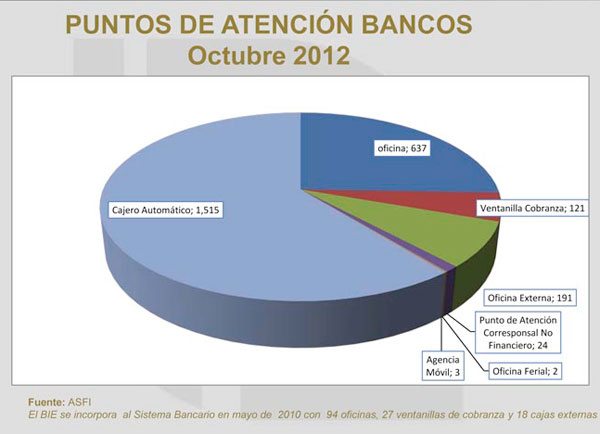 En la gestión 2012, hasta el pasado 30 de septiembre, el sistema bancario nacional instaló 245 nuevos puntos de atención en todo el país, que hasta esa fecha totalizan 2.493. La banca cuenta con el 72% de los puntos de atención del sistema financiero, que totalizan 3.464.