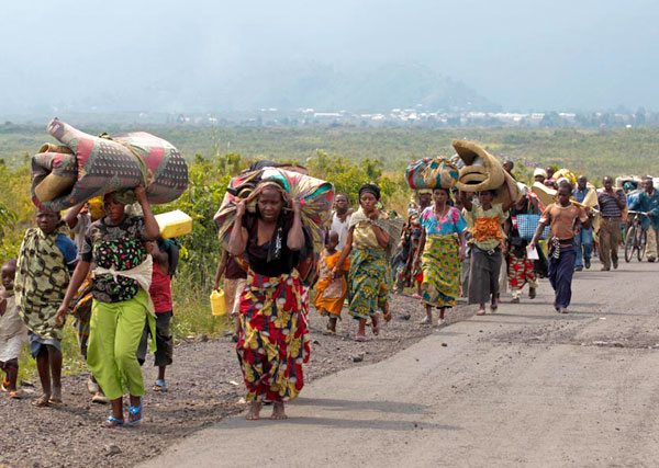 Decenas de personas, residentes de Sake, huyen de los enfrentamientos entre el gobierno y rebeldes del M23, a través de una carretera entre Sake y Goma (República Democrática del Congo). Las Fuerzas Armadas de la República Democrática de Congo, apoyadas por los milicianos Mai Mai, recuperaron la localidad de Sake, tomada ayer por los rebeldes del M23, tras intentos combates que se produjeron ayer. Muchos de los residentes que dejaron sus hogares se detuvieron en un campo de refugiados.