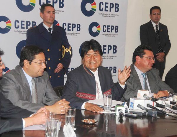 El presidente Evo Morales destacó que un trabajo conjunto entre el Estado y los empresarios privados podría ayudar a desarrollar proyectos sociales más rápidamente en beneficio de la población boliviana, en un discurso pronunciado ayer, durante la entrega de una cancha de césped sintético en la población altiplánica de Collana, en el departamento de La Paz.