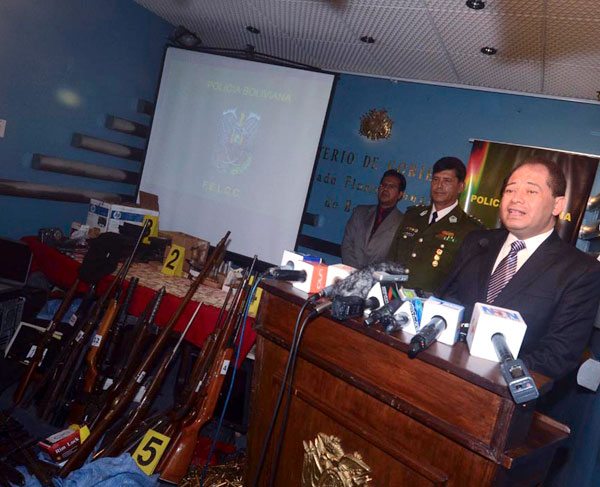 El comandante Regional de la Fuerza Especial de Lucha Contra el Crimen de la zona Sud (Felcc), coronel Alfredo Ramos, informó que en el allanamiento realizado en un domicilio particular de la zona de Tembladerani se incauto 32 armas de fuego, 3.609 cartuchos y 133.280 bolivianos.