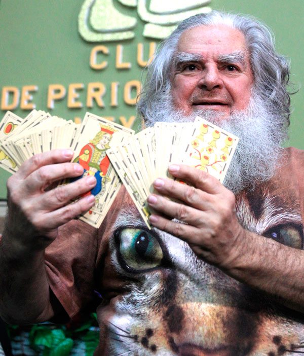 Estuvo acompañado por su hijo, Raúl Vázquez, quien lo apoyó en su lectura de Tarot para responder a decenas de periodistas que preguntaron sobre el futuro de México, de algunos políticos, de artistas y de deportistas.