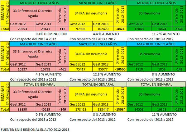 Datos estadísticos comparativos entre la gestión 2012 y la del 2013, analizados por la Unidad de Epidemiología del Seres, muestran que en general la población alteña incrementó sus atenciones en las tres enfermedades: en un 9% en las enfermedades diarreicas, en un 8% las infecciones respiratorias y en un 11% el incremento en neumonías.