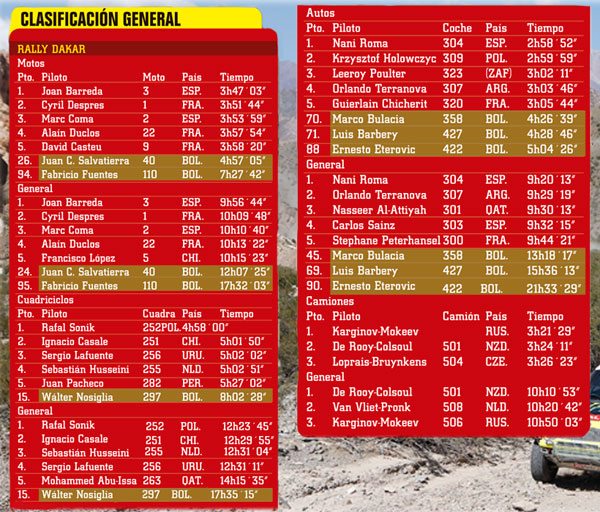 En tanto que el boliviano Juan Carlos Salvatierra recuperó terreno y llegó en el puesto 26 con un tiempo de 4h57´05” y en la clasificación general se ubica en la casilla 24 con 12h07´25” a 2h10´41” del español Barreda . Fabricio Fuentes también tuvo una jornada auspiciosa al llega en el puesto 94 con un tiempo de 7h27´42” y en la clasificación general se ubica en la casilla 95 con un tiempo de 17h32´03” a 7h35´19” del puntero de la competencia.
