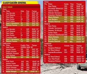 En la categoría motos el español Barreda reafirmó sus condiciones y marcó el ritmo de la competencia lo que le permitió ampliar su ventaja sobre su inmediato seguidor, para la etapa empleó 3h47´03”, desplazando al segundo lugar al francés Cyril Despres.