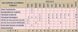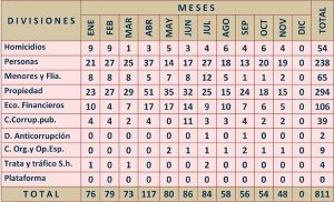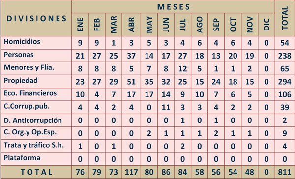 Los datos, recopilados por la Dirección Nacional de Planeamiento y Operaciones de la Policía, en su Departamento Nacional de Estadística, da cuenta de 9 divisiones en las que los delitos son ordenados para su posterior desglose. Entre estas divisiones, las que más casos han reportado y ha llevado la Policía, son las divisiones de “Personas”, “Contra la Propiedad” y la división “Económicos y Financieros”.