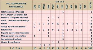 Lo alarmante en esta situación es la cantidad de estafas que se han cometido, con un total de 58 casos, que representa más de la mitad del total de denuncias en toda esta división, en la que también se observa que en cantidades mucho menores, se han denunciado hechos como Manipulación informática, Apropiación indebida, Abusos de firma en blanco, y hasta falsificaciones de moneda, aunque ninguno de ellos supera las 5 denuncias.