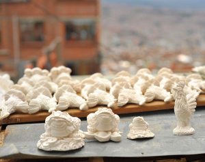 Desde hace 17 años, el día a día de este talentoso artesano discurre entre yeso, pintura y pinceles, elaborando estas miniaturas para las diferentes festividades que dan un suspiro a nuestro calendario de trabajo. Ya sea en Alasita, la Feria de Sucre, Semana Santa o Navidad, la labor de Víctor Manuel no cesa, ya que además de ofrecer su trabajo a tiendas, viaja a lo largo del país comercializando sus productos. Durante los 365 días del año, Víctor Manuel esculpe, pinta y vende al por mayor el trabajo con el que alimenta a su pareja y sus dos hijos.